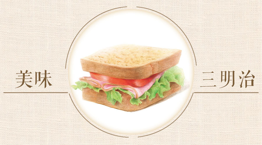 两片面包,夹上西红柿、培根和生菜,几分钟就可以做成一份美味的三明治早餐了!画面包片的时候,下笔要轻一些,注意表现出面包松软的质感。